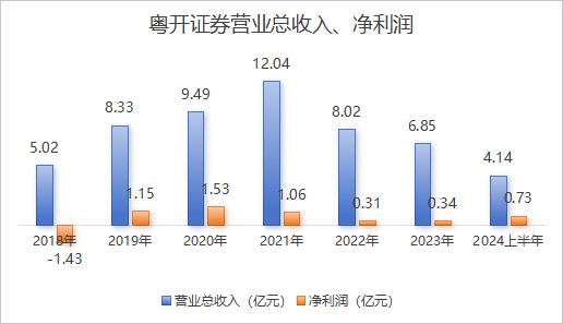 2024年粤开证券业绩斐然,上半年营业收入4.14亿元,同比增长13.88%;归母净利润0.73亿元,同比增长39.44%。