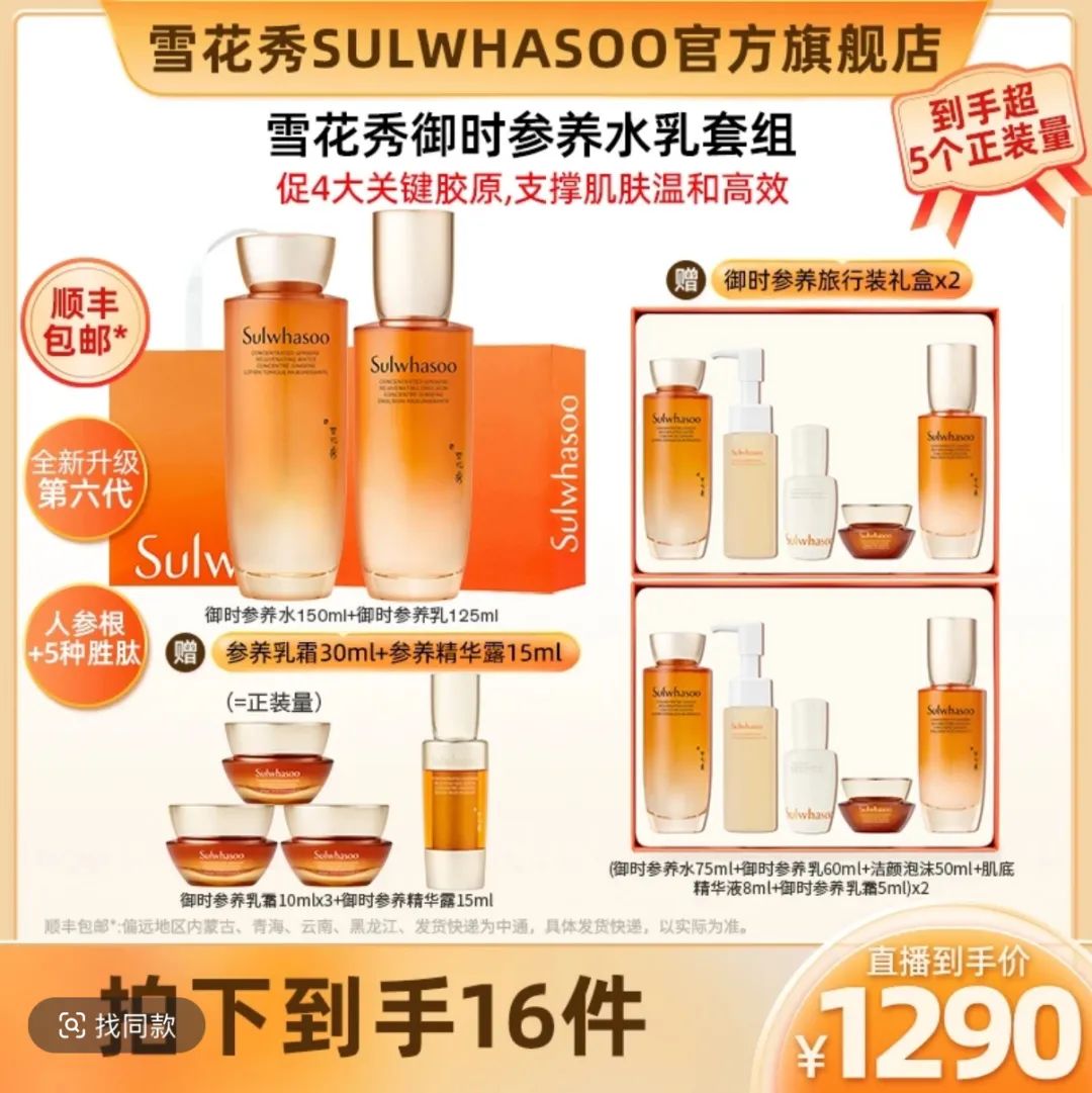 雪花秀不是孤例,为讨好下沉市场,韩妆正在经历危险的"土味变异":The Whoo与抖音达人广东夫妇深度合作,直播间常有“天气丹买一到手21件”套餐,将万元套盒砍至不足两千;就连顶级韩妆品牌赫妍都开始参与拼多多“百亿补贴”。