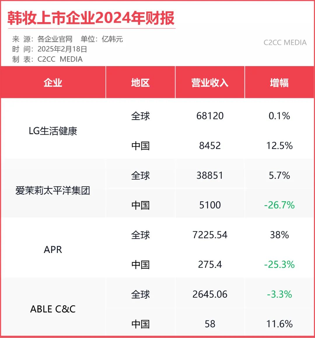 爱茉莉太平洋集团、APR业绩呈双位数下滑;LG生活健康、ABLE C&C在华营收同比则呈双位数增长。