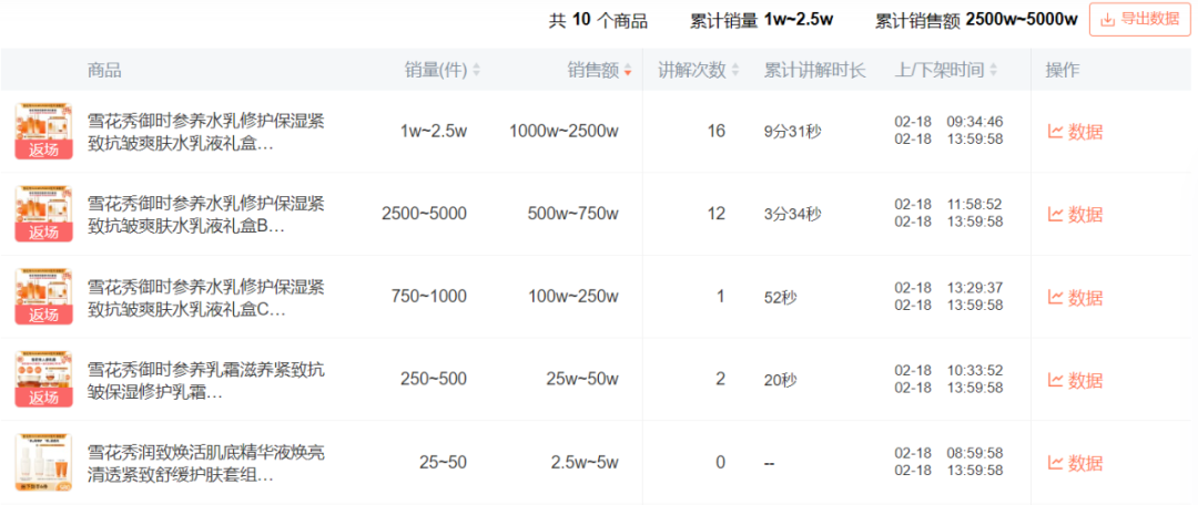 该场直播为雪花秀带来了可观的收益,据蝉妈妈显示,整场直播时长为5小时5分钟,观看人次高达602.3W,销售额为2500W~5000W。直播间共46个美妆产品,其中雪花秀最多,占10个,一半的产品产生了销售额。
