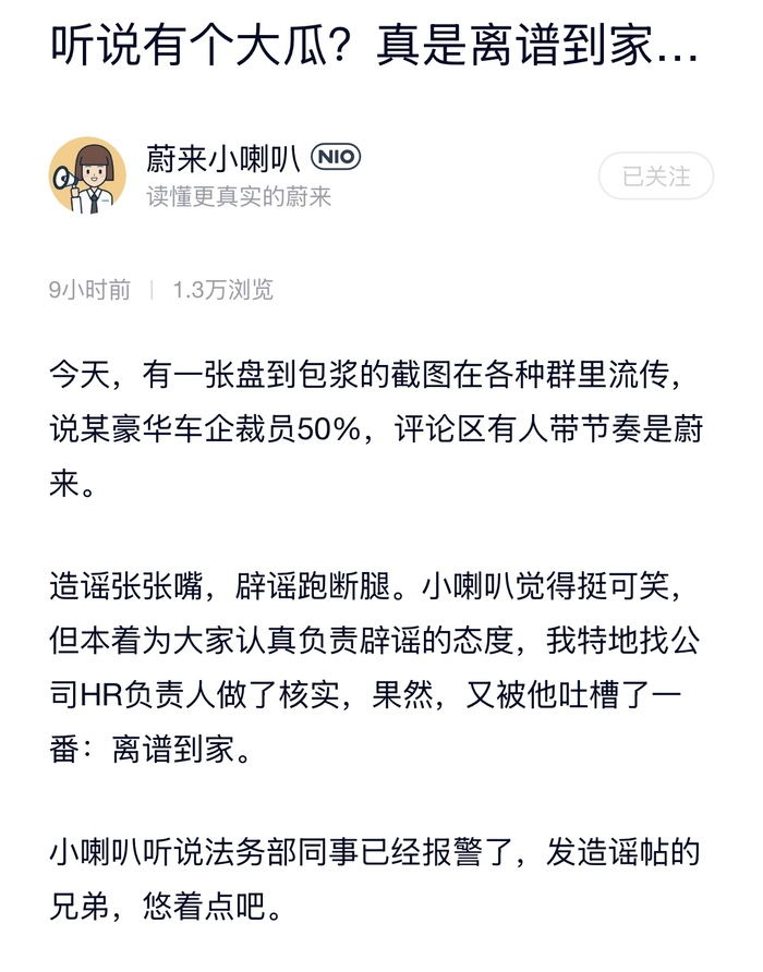 针对网上流传的一张爆料某豪华车企裁员50%的截图,蔚来汽车官方发文辟谣。