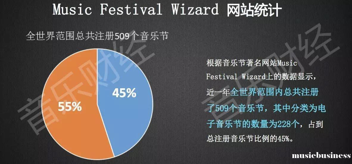 第三个趋势我想从演出市场来分析,我们先看几组国外数据。首先,我们看国外音乐节注册网站显示,到目前为止全世界范围内在这个网站上共注册了509个音乐节,其中分类为电子音乐节的数量为228个,约占总注册音乐节数量的45%,但大家注意,这是注册的音乐节,还不是所有音乐节举办的数量。