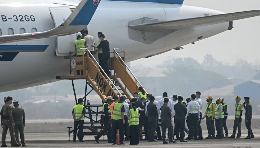 随后一架中方包机降落在湄索机场,接回这些中国籍人员,目的地为南京。另据《曼谷邮报》等当地媒体报道,南方航空提前与湄索机场协调安排航班,未来三天中方总共派出16个航班,每天最多安排6个。