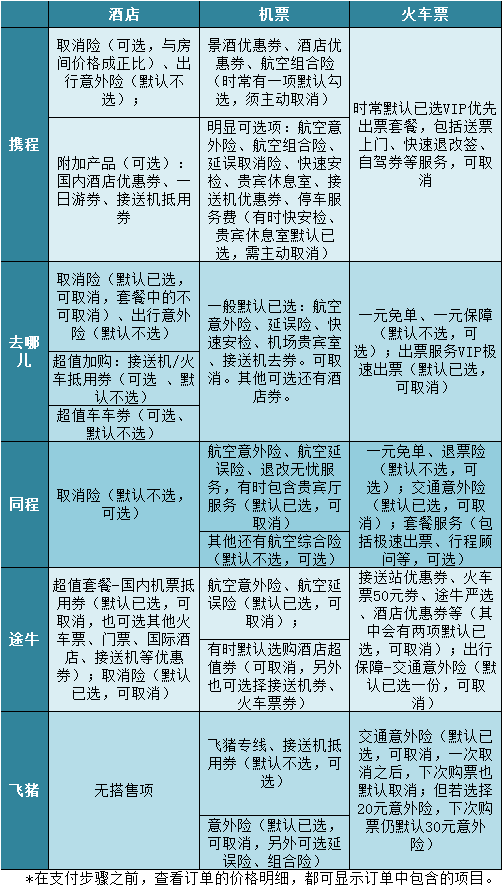 除了机票产品销售过程中的优惠券、保险搭售,各类平台在其他产品上也有不少搭售项目,界面新闻记者抽取了几家主要OTA的机票、酒店、火车票产品搭售情况如下。