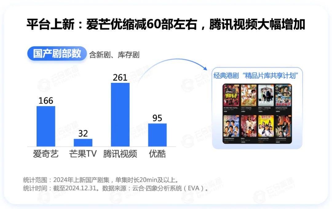 举个很简单的例子。云合数据1月份发布的《2024年长剧集网播年度观察报告》中提到,2024年,在长视频平台中,爱奇艺上新的国产剧集是第二多的: