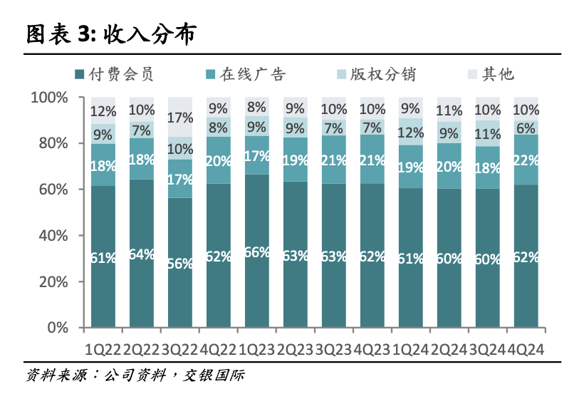 这带来的直接影响,便是会员收入增长空间受限——爱奇艺的营收结构中,会员服务收入是大项,收入贡献长期维持在60%上下。