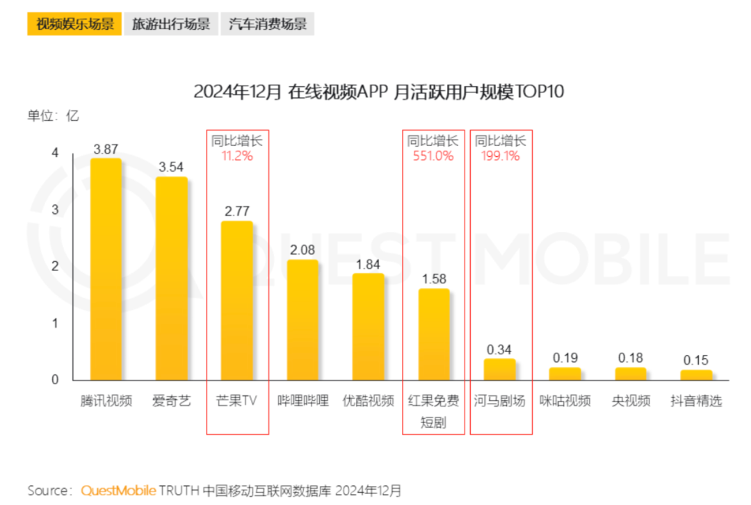 2月18日,QuestMobile发布的数据显示,2024年12月,红果短剧App的月活用户规模已经来到了1.58亿,同比增长了551%,在在线视频App的月活跃用户规模排行中,位列第六。