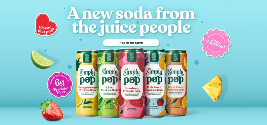但和Olipop和Poppi选择了一致的肠道健康路线宣传产品外,Simply Pop也在着重提及产品20%-30%的果汁成分,在品牌官网上,Simply Pop的宣传语是“为果汁爱好者准备的新苏打水(A new soda from the juice people)。”
