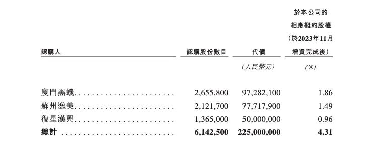 根据招股书,苏州黑蚁、苏州逸美及复星汉兴等三名认购人认缴老铺黄金新增股本614.25万股股份,总代价为2.25亿元。