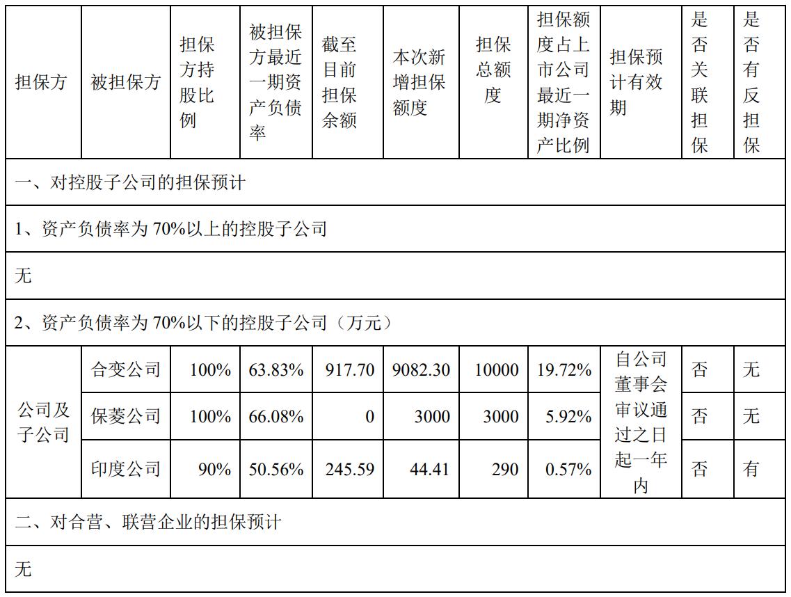 其中,向天威保变(合肥)变压器有限公司(以下简称“合变公司”)提供非融资性保函担保总额不超过1亿元;向保定保菱变压器有限公司(以下简称“保菱公司”)提供非融资性保函担保总额不超过3,000万元;向保变股份-阿特兰塔变压器印度有限公司(以下简称“印度公司”)提供非融资性保函担保总额不超过290万元。