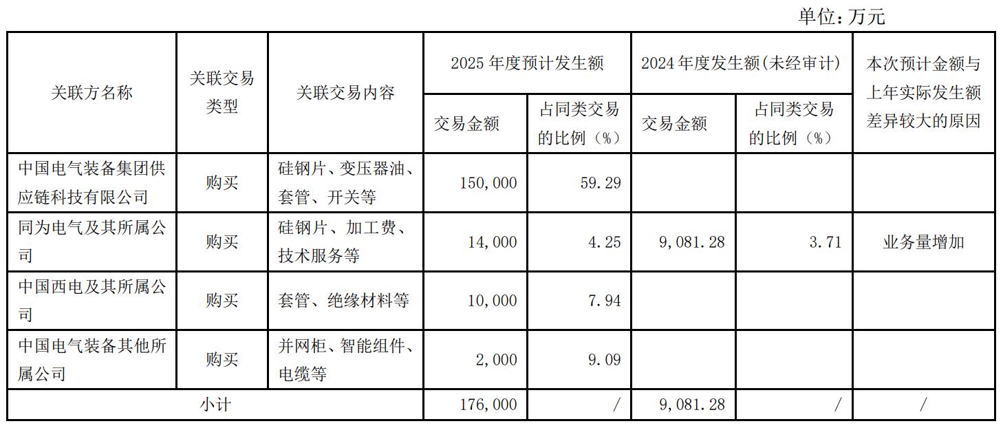 公告显示,2025年,公司拟从关联公司中国电气装备集团供应链科技有限公司(简称“供应链公司”)、保定同为电气设备有限公司(简称“同为电气”)及其所属公司、中国西电电气股份有限公司(简称“中国西电”)及其所属公司等单位购买商品、接受劳务的关联交易总额为176,000万元,较2024年从上述公司购买商品、接受劳务的交易总额9,081.28万元(未经审计)增加1,838.05%。