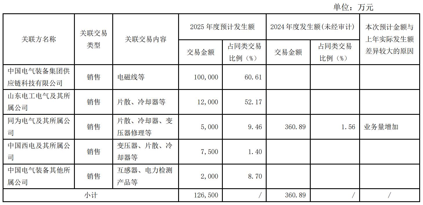 与此同时,2025年,公司拟向关联公司供应链公司、山东电工电气集团有限公司(“山东电工电气”)及其所属公司、同为电气及其所属公司、中国西电及其所属公司等单位销售商品、提供劳务的关联交易总额126,500万元,较2024年向上述公司销售商品、提供劳务的交易总额360.89万元(未经审计)增长34,952.23%。