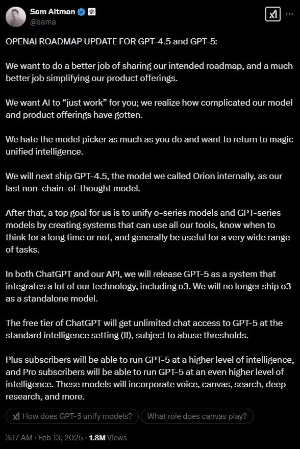 值得一提的是,2月13日凌晨,OpenAI首席执行官萨姆·奥尔特曼公布了GPT-4.5和GPT-5的最新消息。奥尔特曼宣布,OpenAI将在未来几个月内推出名为GPT-5的模型,该模型将整合OpenAI的大量技术,包括o3模型,并应用于聊天机器人ChatGPT以及API平台,此外,更重要的是,免费版ChatGPT能在标准智能设置下无限制地与GPT-5进行对话。