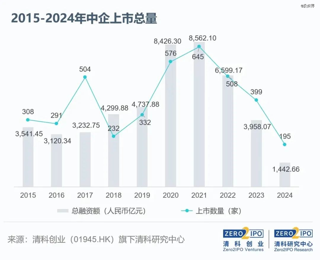 如今IPO境况众所周知:根据清科创业旗下清科研究中心统计,2024年中企境内外上市195家,同比下降51.1%,首发融资额约合人民币1442.66亿元,同比下降63.6%,上市企业数量和融资金额为近10年新低。
