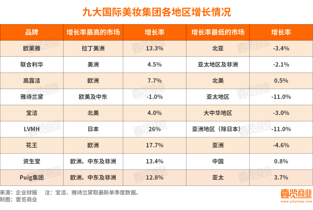 LVMH、雅诗兰黛在中国的销售额减少11%,花王在亚洲地区销售额减少了4.6%,欧莱雅在北亚地区销售额减少了3.4%...即便是净销售额在过去一年增长最多的PUIG,在亚太地区也仅取得3.7%的增长,远低于其他市场。