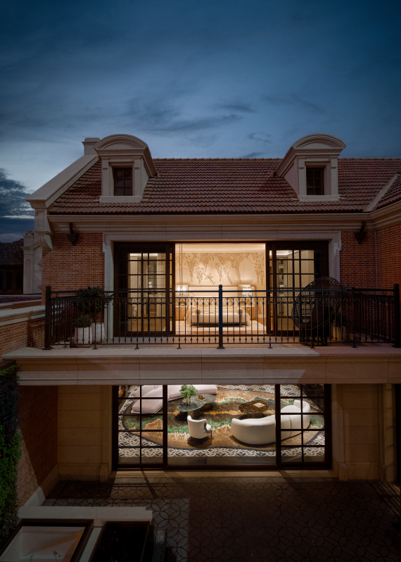 经典的技法,现代的演绎,康定壹拾玖立面对标伦敦切尔西将军公馆与怀特利酒店的建筑美学,运用经过千年淬炼,无惧时间永恒的进口白世茂石材,在立面竖向构件上,挑战性地使用圆弧形石材及瓦楞板,不计成本投入时间与精力,苛求惊艳世人完美的立面曲线,与石材的工艺相呼应,窗框采用转角整体拉弯工艺,并植入家族式勋章,以金属镶嵌的形式呈现在窗框上,每一枚“勋章”都经过精雕细琢,象征康定壹拾玖门牌的身份、传承与荣耀。