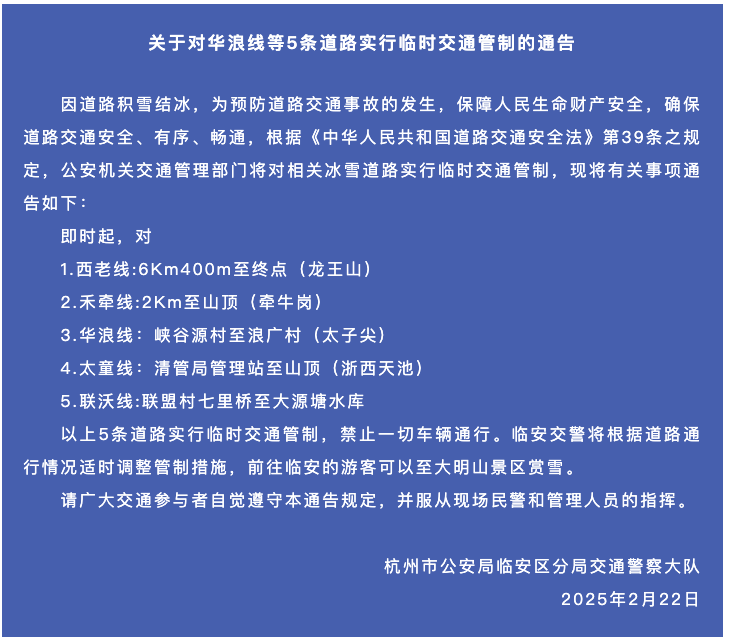 此外,杭州市公安局临安区分局交通警察大队发布了对相关冰雪道路实行临时交通管制的公告,对西老线(龙王山)、禾牵线(牵牛岗)、华浪线(太子尖)、太童线(浙西天池)、联沃线等5条道路实行临时交通管制,禁止一切车辆通行。临安交警将根据道路通行情况适时调整管制措施,前往临安的游客可以至大明山景区赏雪。
