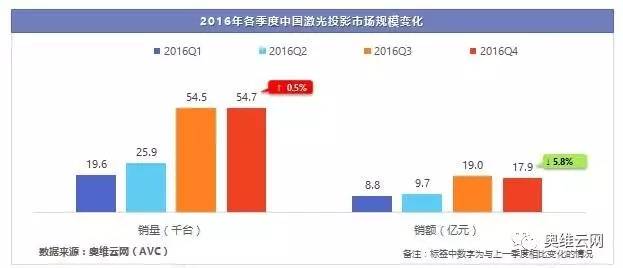 2016年是激光投影崛起的一年,据奥维云网(AVC)研究数据显示,激光投影市场销量规模超过15万台,销额规模达55亿元。其中,16Q4销量是5.5万台,环比上升0.5%;销额为17.9亿元,环比下降5.8%。