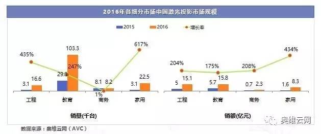 根据奥维云网(AVC)研究数据显示,2016年,工程市场销量规模是16.6千台,销额为15.1亿元;教育市场销量是103千台,销额为15.8亿元。商务市场销量是8.2千台,销额为2.3亿元;家用市场激光投影机销量是22.5千台,销额为8.3亿元。从各细分市场激光投影销量规模增长率看,家用市场激光投影相比2015年增速最快,增长率达617%。
