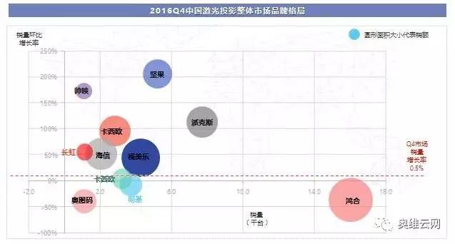 16Q4综合家用、教育、工程、商务各市场来看,鸿合在销量和销额均为全行业第一,16Q4销售规模唯一超万台激光投影品牌。其在教育市场的销量份额将近一半,在整体市场达29%。坚果是家用市场助推的中坚力量。销量相比三季度增幅达206%。海信、长虹16Q4主要注重商教市场的推广。海信商务市场销量增速达168%。16Q4派克斯在教育市场取得了很大的突破;销量相比三季度增幅超过113%,为各品牌第一。视美乐在工程、商务、教育市场均呈上升,尤其商务市场的增速达500%以上。帅映主做工程市场,在工程市场中的品牌里增速最快,高达160%以上。