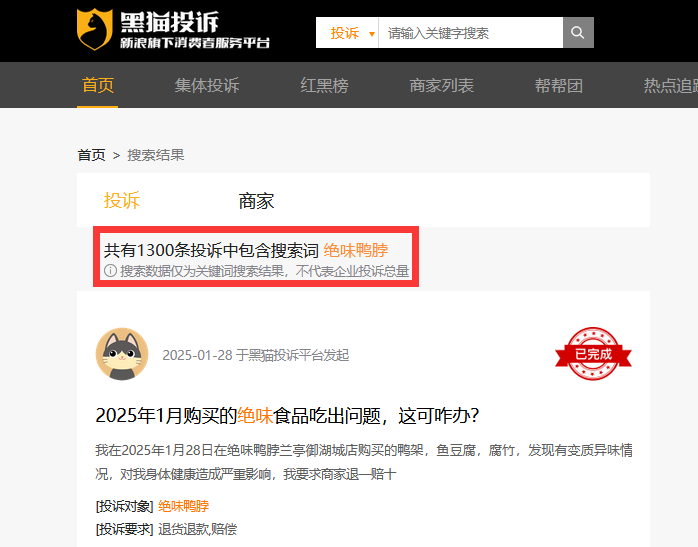 事实上,黑猫投诉平台上,以“绝味鸭脖”为关键词进行搜索累计有1300条投诉,内容大多涉及“食出异物”“食后腹泻呕吐”“味道发馊”等问题,甚至有人因此住院。