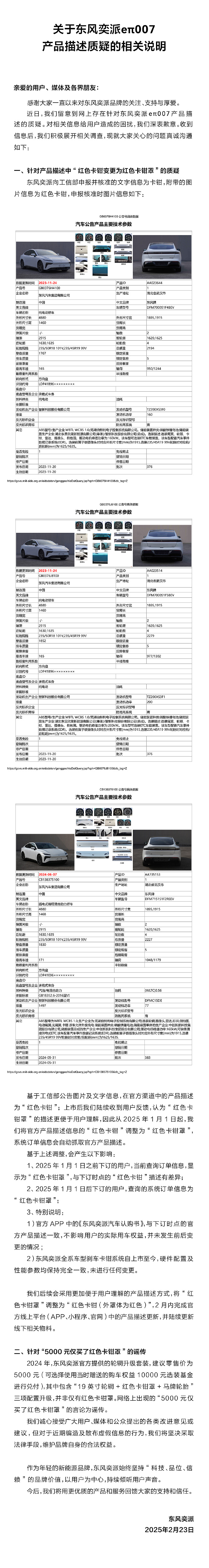 2月23日,东风奕派发布《关于东风奕派eπ007产品描述质疑的相关说明》。针对产品描述中“红色卡钳变更为红色卡错罩”的质疑,声明称后续会采用更加便于用户理解的产品描述方式,将“红色卡钳罩”调整为“红色卡钳(外罩体为红色)”,2月内完成官方线上平台中的产品描述更新,并陆续更新线下相关物料。针对“5000元仅买了红色卡钳罩”的质疑,东风奕派称,2024年官方提供的轮辋升级套装,建议零售价为5000元,其中包含“19英寸轮辋+红色卡钳罩+马牌轮胎”三项配置升级,并非仅有红色卡钳罩。网络上出现的“5000元仅买了红色卡钳罩”的言论为谣传。东风奕派表示,“对相关信息给用户造成的困扰,我们深表歉意。”