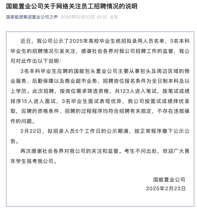 2月23日,国家能源集团置业公司发布关于网络关注员工招聘情况的说明,内容如下: