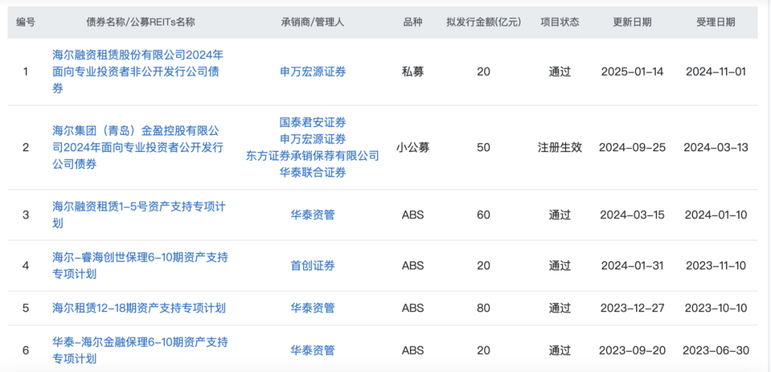 除此之外,在融资发债方面,海尔集团过去两年也是动作频频。上交所债券项目信息平台显示,2023年至今,海尔共计发行了9只债券、私募、ABS等,合计发行金额340亿元。其中2024年至今的发行金额是150亿元。