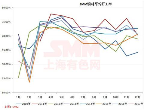 据SMM统计的近几年铜材平均开工率数据显示,基本上4-5月为开工率的峰值,6月开始下滑,这也正好与传统消费季节性特征相对应。从铜期货价格走势上看,4-5月也多为一年价格中的高位阶段。