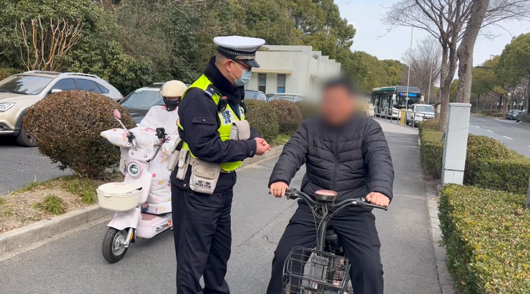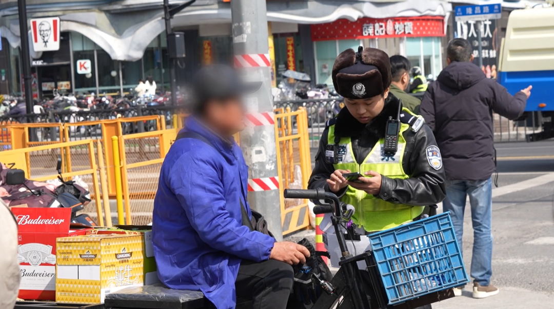 此外,还有一名骑行者的情况有些“复杂”:头上“顶”着头盔,但又没完全戴上——本该系上的安全扣垂落脸颊两侧,头盔就侧挂在头上。“你这样‘戴’头盔,一旦受到碰撞,头盔很容易弹飞出去,根本就起不到保护作用。”冯晨顺将他拦下后,让他系上安全扣并进行安全教育。