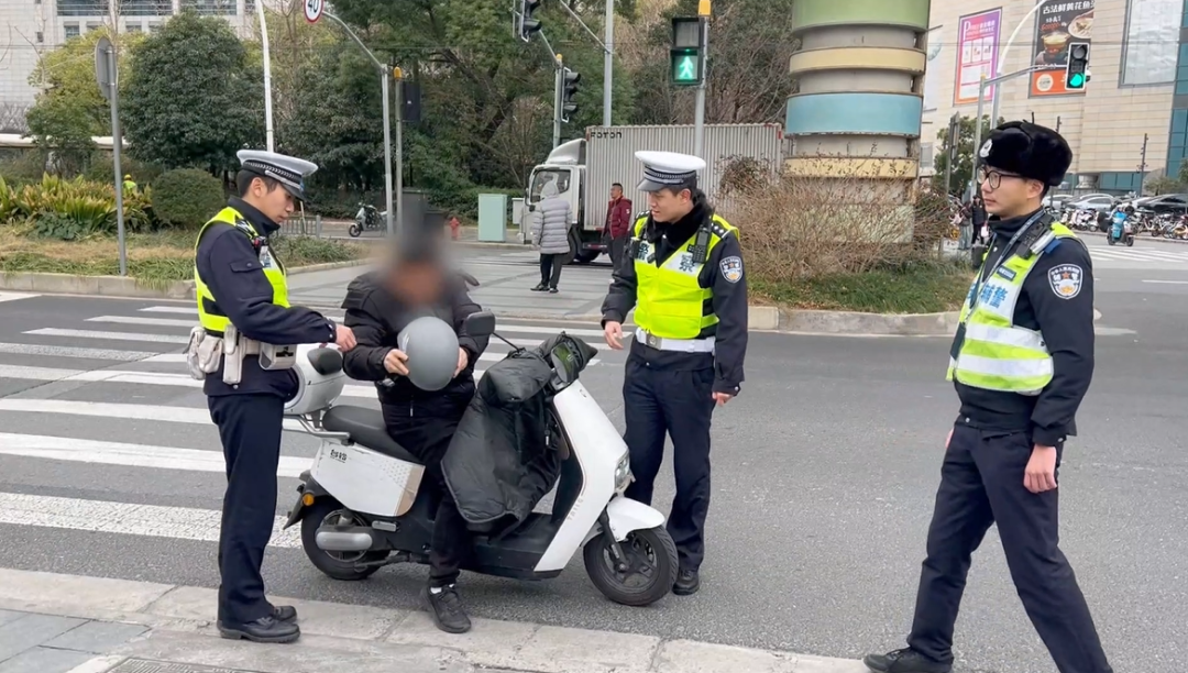 在杨浦区隆昌路长阳路路口,电动自行车络绎不绝,多数骑行者都佩戴着头盔,但仍有个别未佩戴头盔的人被执勤交警拦下。因未戴头盔,交警将电动自行车骑行者吴女士拦下。被问及是否有安全头盔时,她解释说头盔忘在家里了,“今天因为要赶着去银行办事,着急出门就忘了拿,平时都会戴的。”