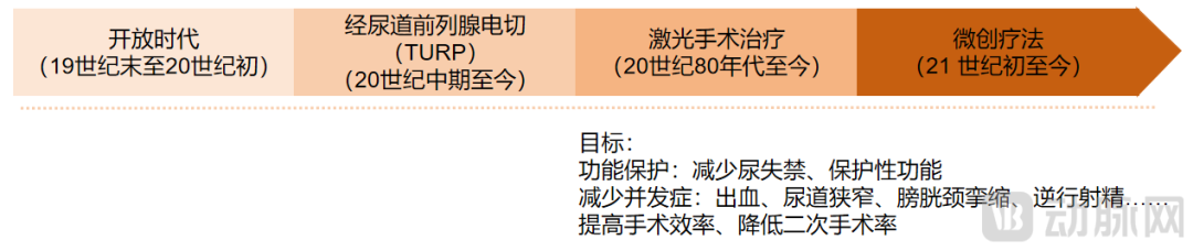 BPH的外科治疗方式按发展时间排序,大致可分为:开放手术(19世纪末至20世纪初)→经尿道前列腺电切(TURP)(20世纪中期至今)→激光手术治疗(20世纪80年代至今)→微创疗法(21 世纪初至今)。