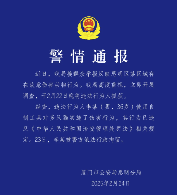 厦门市公安局思明分局2月24日通报,经查,违法行为人李某(男,36岁)使用自制工具对多只猫实施了伤害行为,其行为已违反相关规定。23日,李某被警方依法行政拘留。