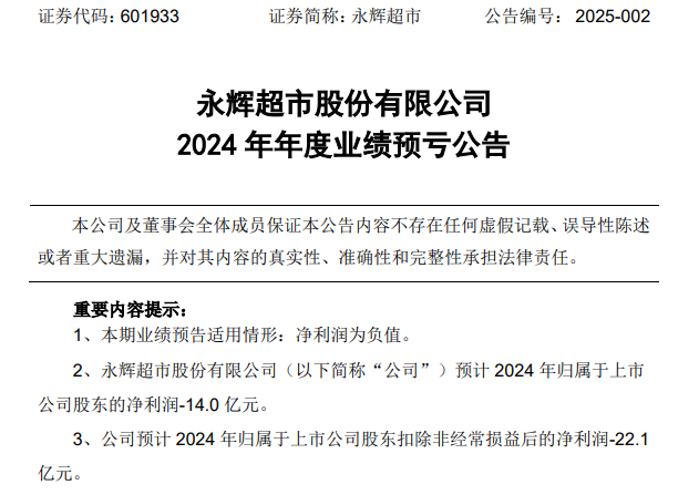 近期,永辉超市发布2024年年度业绩预亏公告,公司预计2024年归属于上市公司股东的净利润亏损14亿元,预计2024年归属于上市公司股东扣除非经常损益后的净利润亏损22.1亿元。