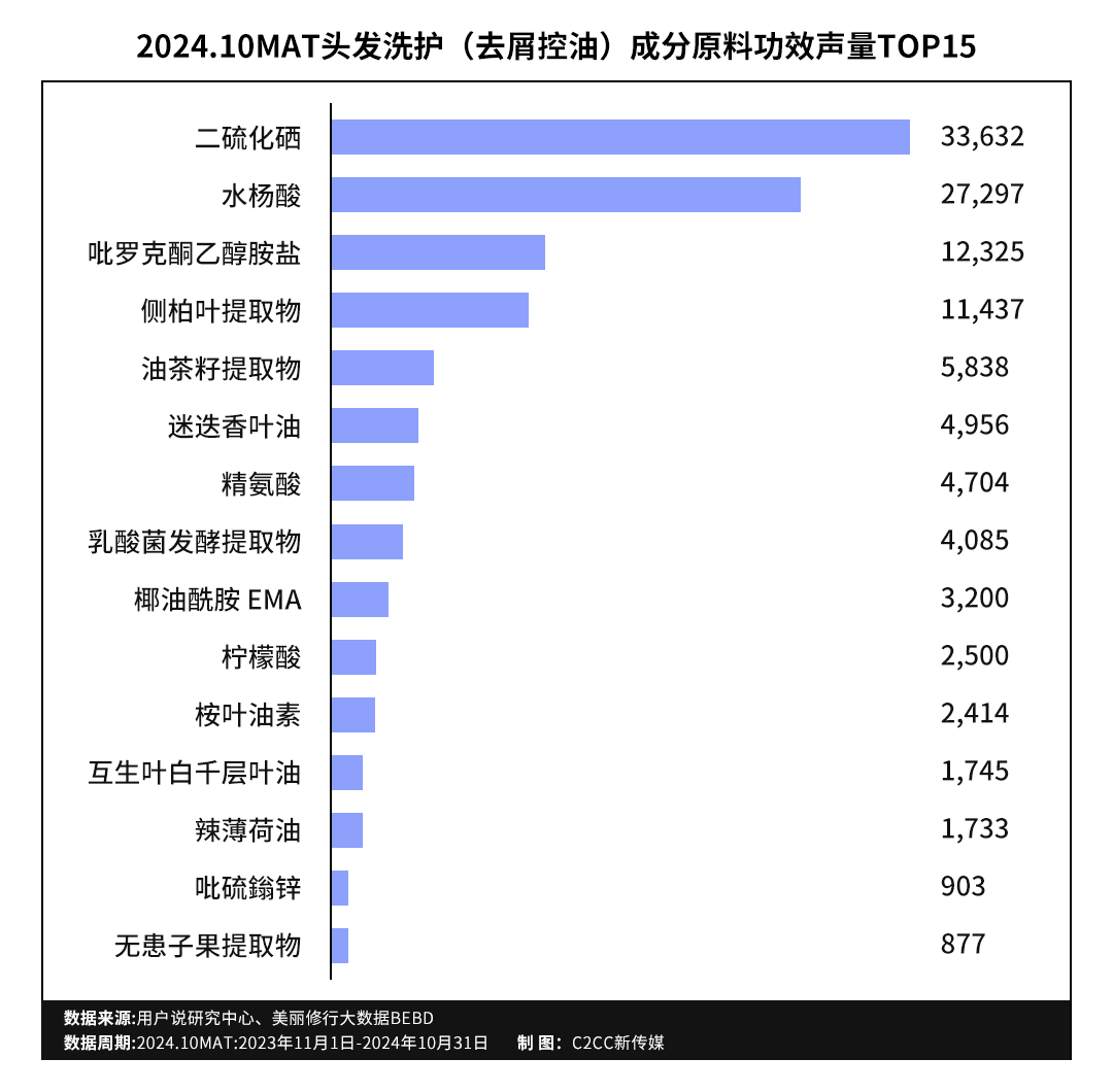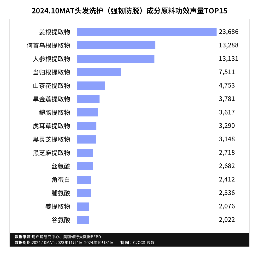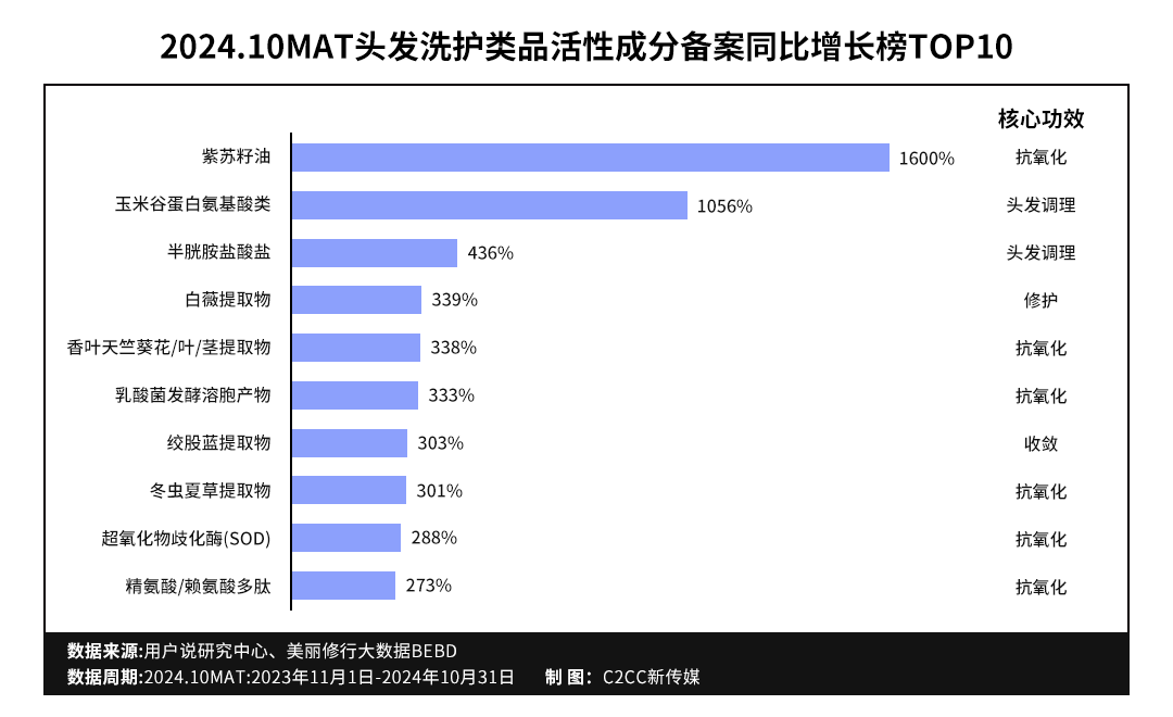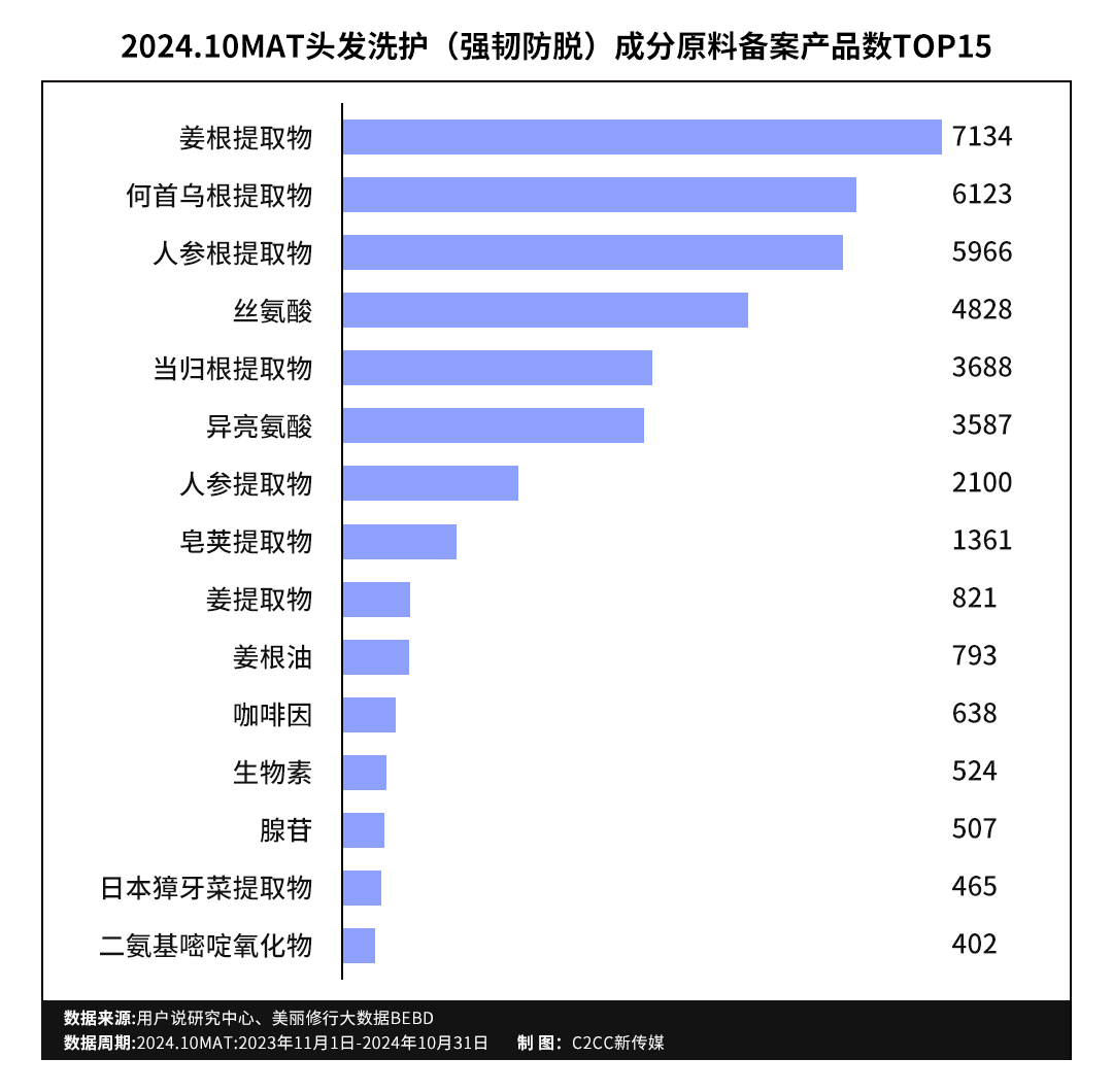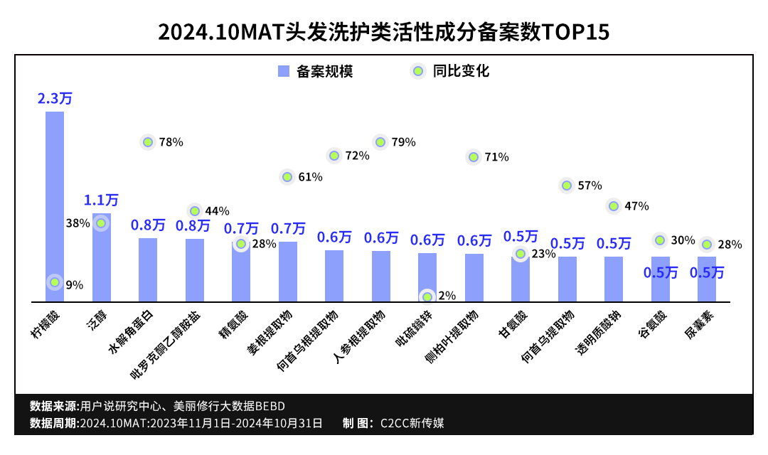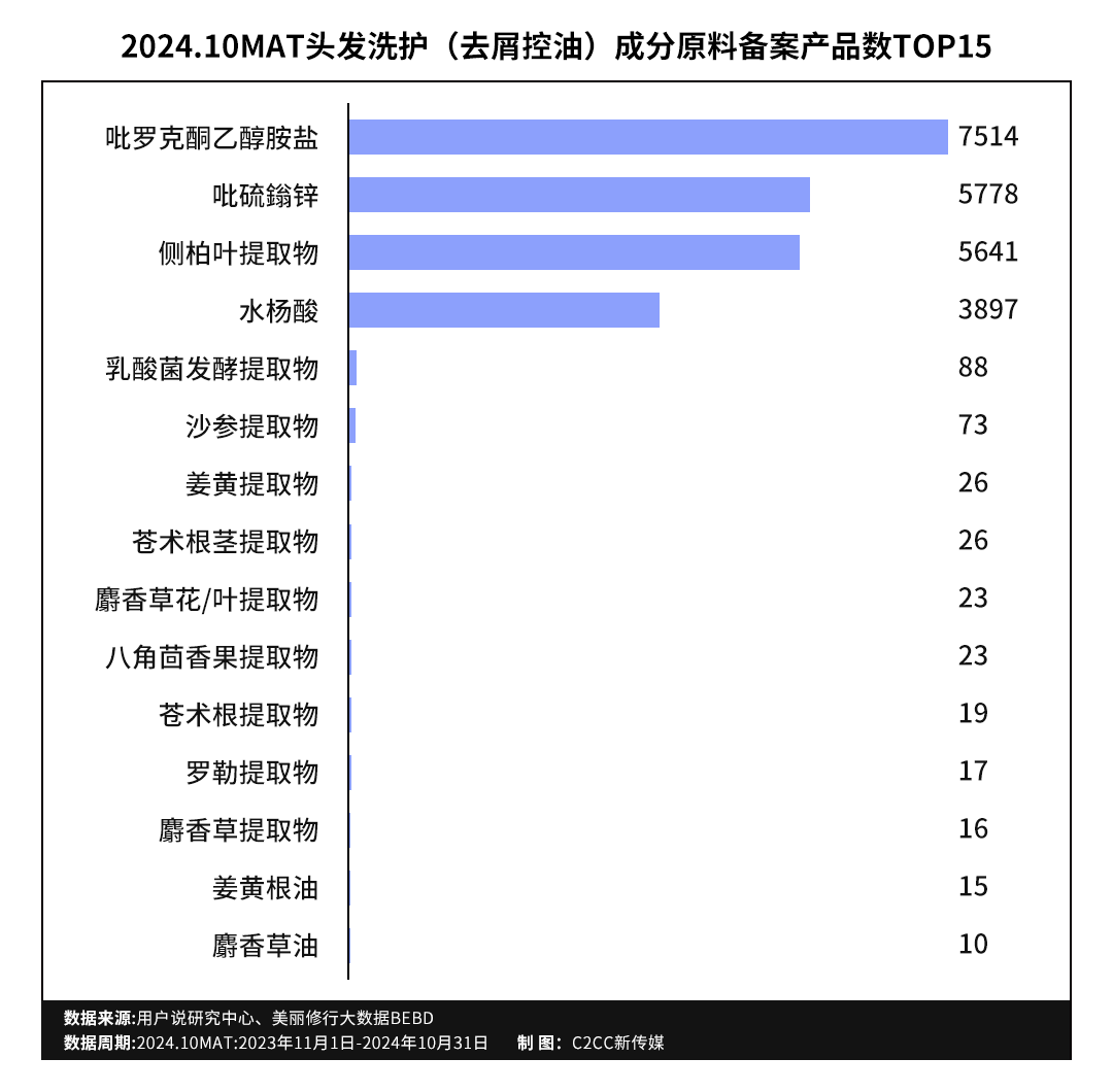 头皮护理、控油去屑的高增长、高需求也在2024.10MAT头发洗护品类成分备案数据被验证。