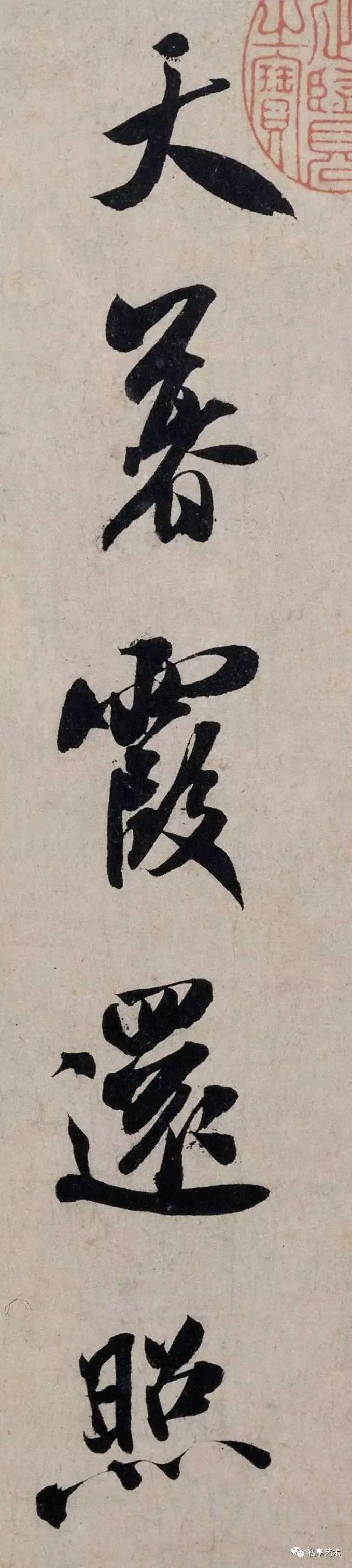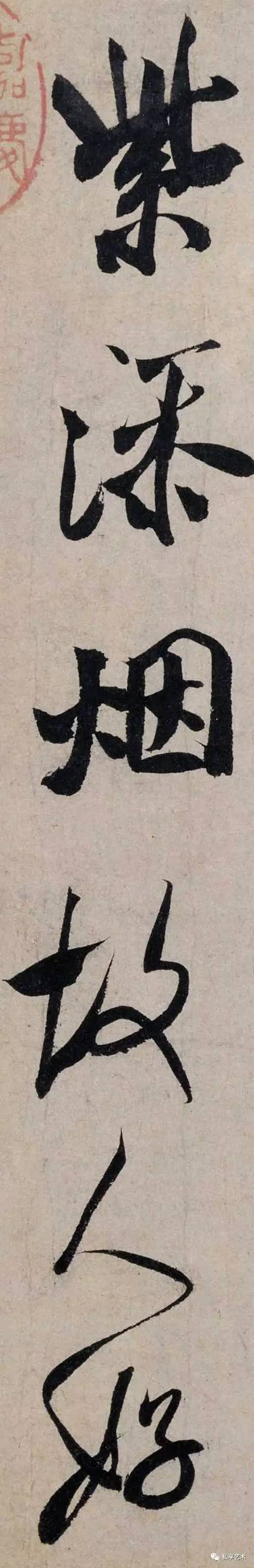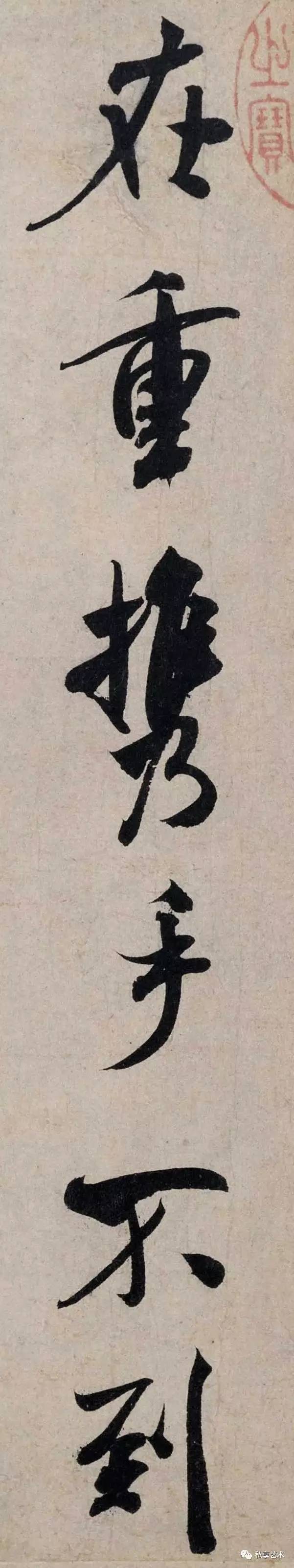 此帖书自作七绝一首,运笔如刷,笔力雄健,使转灵动,结字端妍,结态造势宽展肥美,精神饱满,无款印。当为米芾中年书法之精品。此帖流传有绪,历代著录于《墨缘汇观》、《石渠宝笈续编》,刻入《三希堂法帖》。藏于北京故宫博物院。