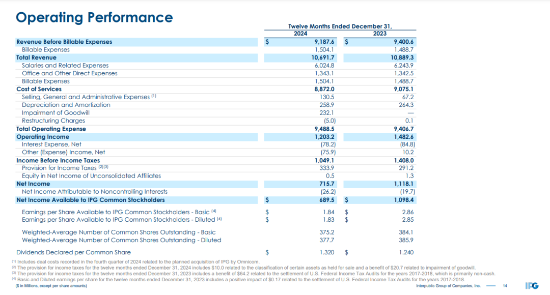 2月12日,IPG发布了最新财报,2024全年净营收91.9亿美元,同比下滑2.3%,不甚理想的财报数字反应出了出这个广告巨头在合并前夜的挣扎与阵痛,一时之间涌现出不少唱衰的声音。