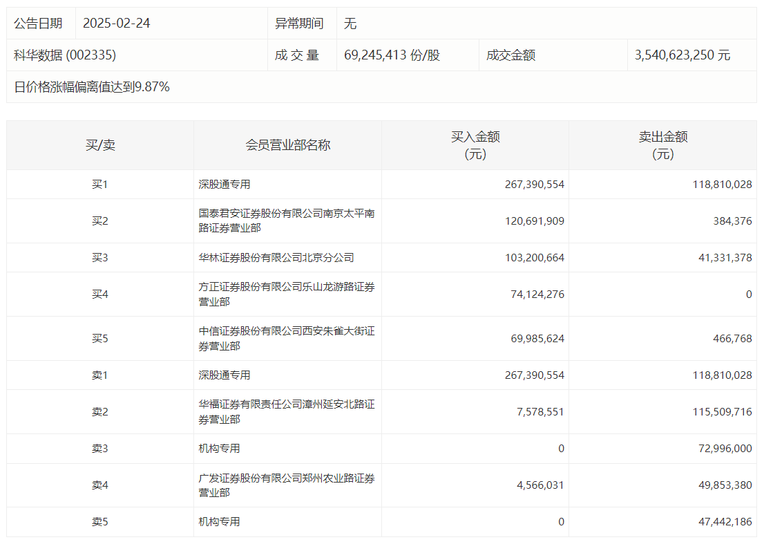 龙虎榜 | 科华数据加速涨停,深股通买入2.67亿元并卖出1.19亿元