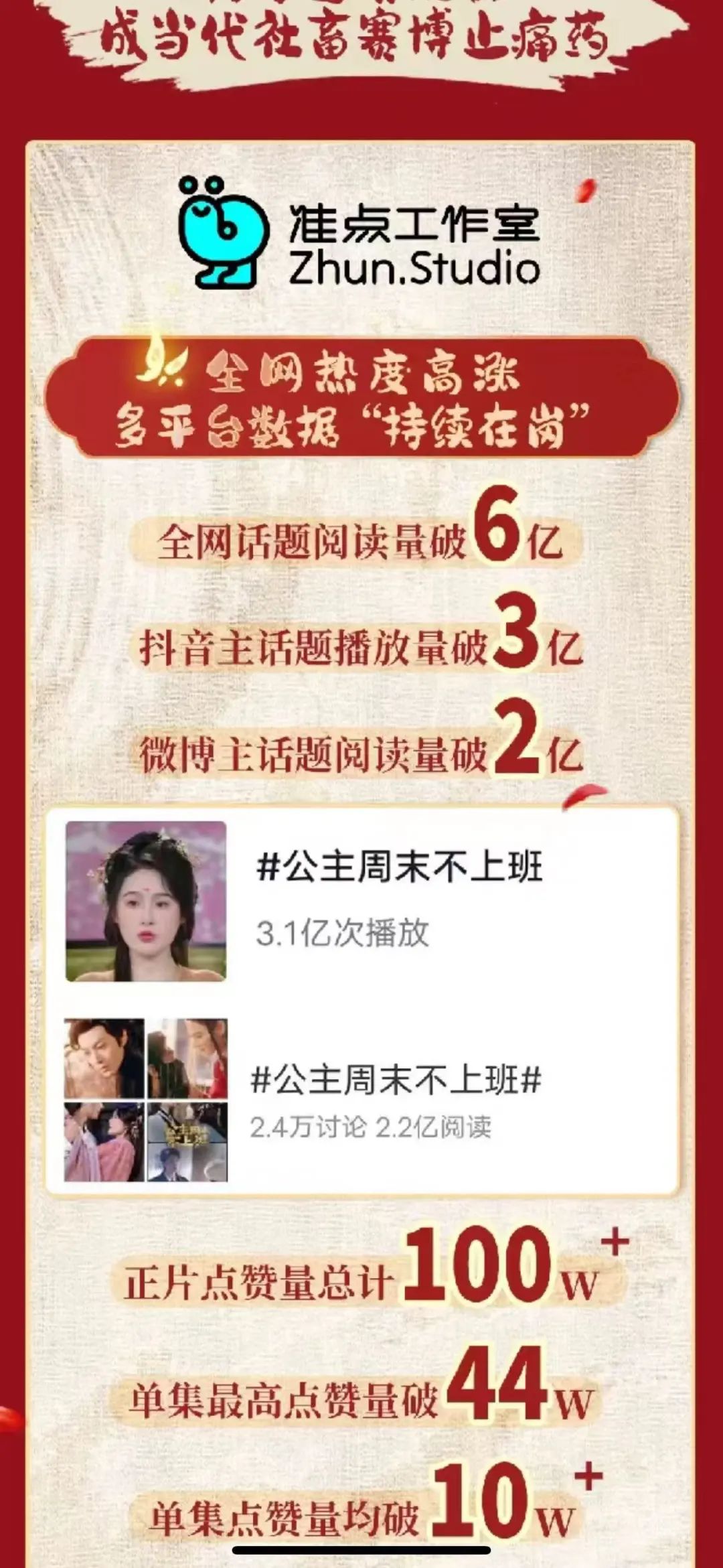 2月8日, BOSS直聘首部定制竖屏短剧《公主周末不上班》在抖音和小红书播出后,引发了一轮网友的关注和讨论。目前这部系列短剧播出后,全网话题阅读量破6亿,抖音主话题播放量3.1亿,单集最高播放量44.3万;微博话题破2亿;小红书总浏览量为24.2万。