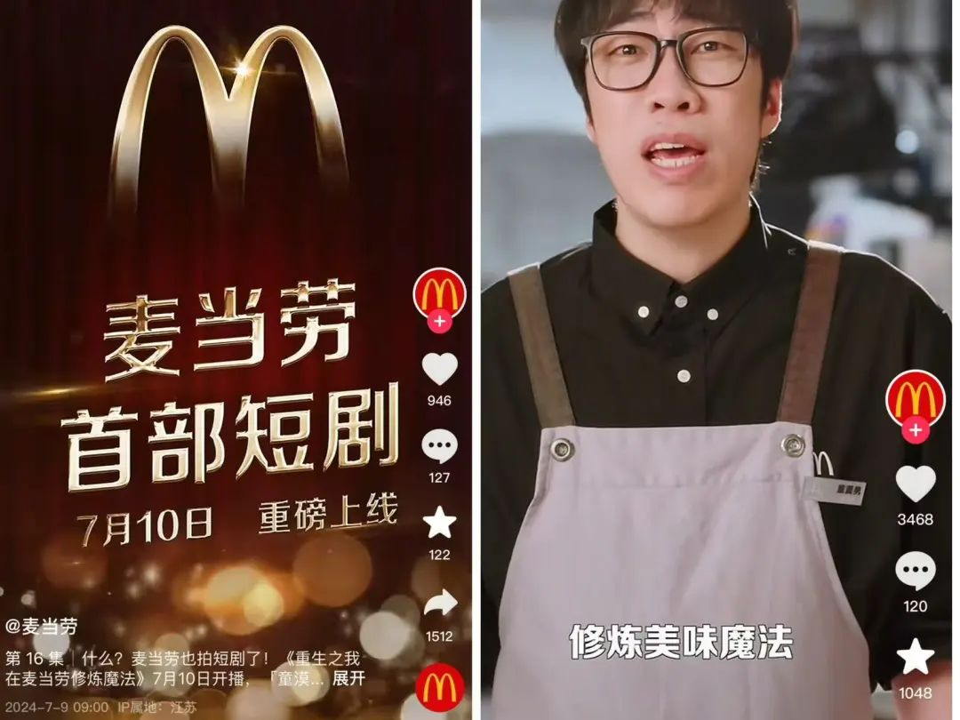 根据勾正科技发布的《短剧营销正当时:2024年H1微短剧行业观察与营销指南》数据显示,2024年上半年,品牌合作商业微短剧数量同比增长68%。其中餐饮品牌的短剧合作最为活跃:2024年下半年开始,麦当劳首部短剧《重生之我在麦当劳修炼美味魔法》上线;两个月后,肯德基的《重生皇后》也发布了;紧随其后的是蜜雪冰城的动画短剧《雪王驾到》,和同一时间推出的定制短剧《雪王的穿越日记》;太二酸菜鱼也推出过定制短剧《实习霸总狂宠卖鱼妹》……