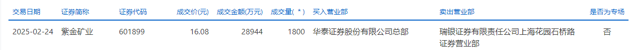 紫金矿业今日大宗交易成交1800万股,成交额2.89亿元