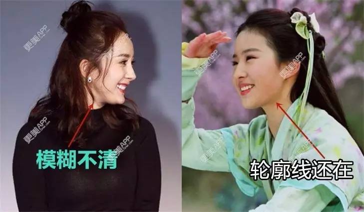 尤其笑起来更让下颌线看起来模糊不清,而刘亦菲的轮廓线还可以看到一些