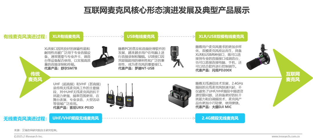 相较于传统麦克风,互联网麦克风在产品形态上有了显著的升级。有线麦克风从传统的XLR麦克风演进为XLR/USB双模麦克风;无线麦克风从UHF/VHF频段无线麦演进为2.4G无线麦。