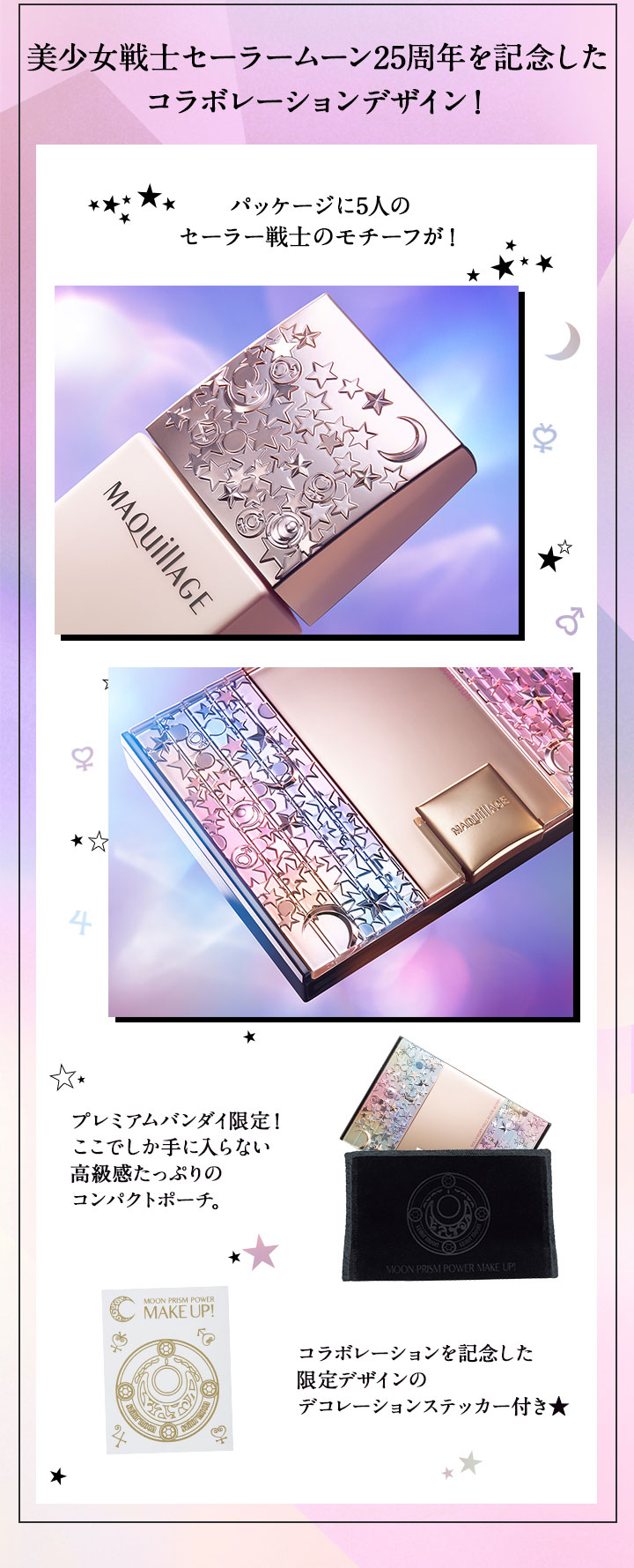 今年是作品诞生25周年,品牌们当然不会忘了这个和作品联名圈钱的机会。比如资生堂旗下的高端彩妆线MAQuillAGE就推出了美少女战士限定妆前乳和粉饼套装,星星月亮浮雕的包装非常少女心,今年年初一开放预售就迅速售罄了。