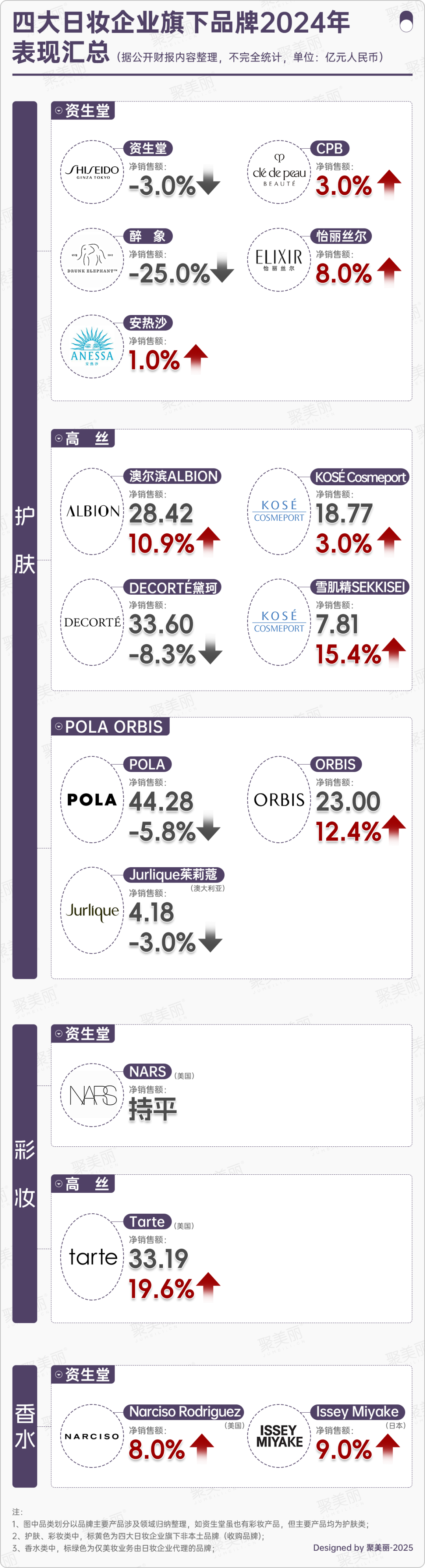 由此可见,日妆四巨头2024年表现虽各有不同,但是整体盈利能力下滑已是不争事实。不仅如此,高端品牌(尤其是护肤类)昔日一度是日妆向外扩张的王牌,如今也呈现疲软。加之,全球经济下行等原因,以及中国消费者趋于理性消费,不再崇尚外资产品,这对入华多年的日妆巨头们的发展带来不容忽视的挑战。这背后同样也体现出,日妆整体亟需重启、大洗牌。