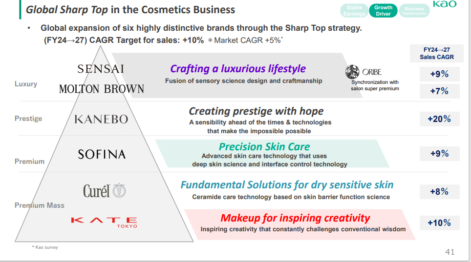 而花王就化妆品业务未来发展制定新计划:向全球市场发展六大品牌,即两大奢侈品牌SENSAI和MOLTON BROWN、高端品牌佳丽宝,以及中端品牌SOFINA、两大大众品牌KATE与珂润。