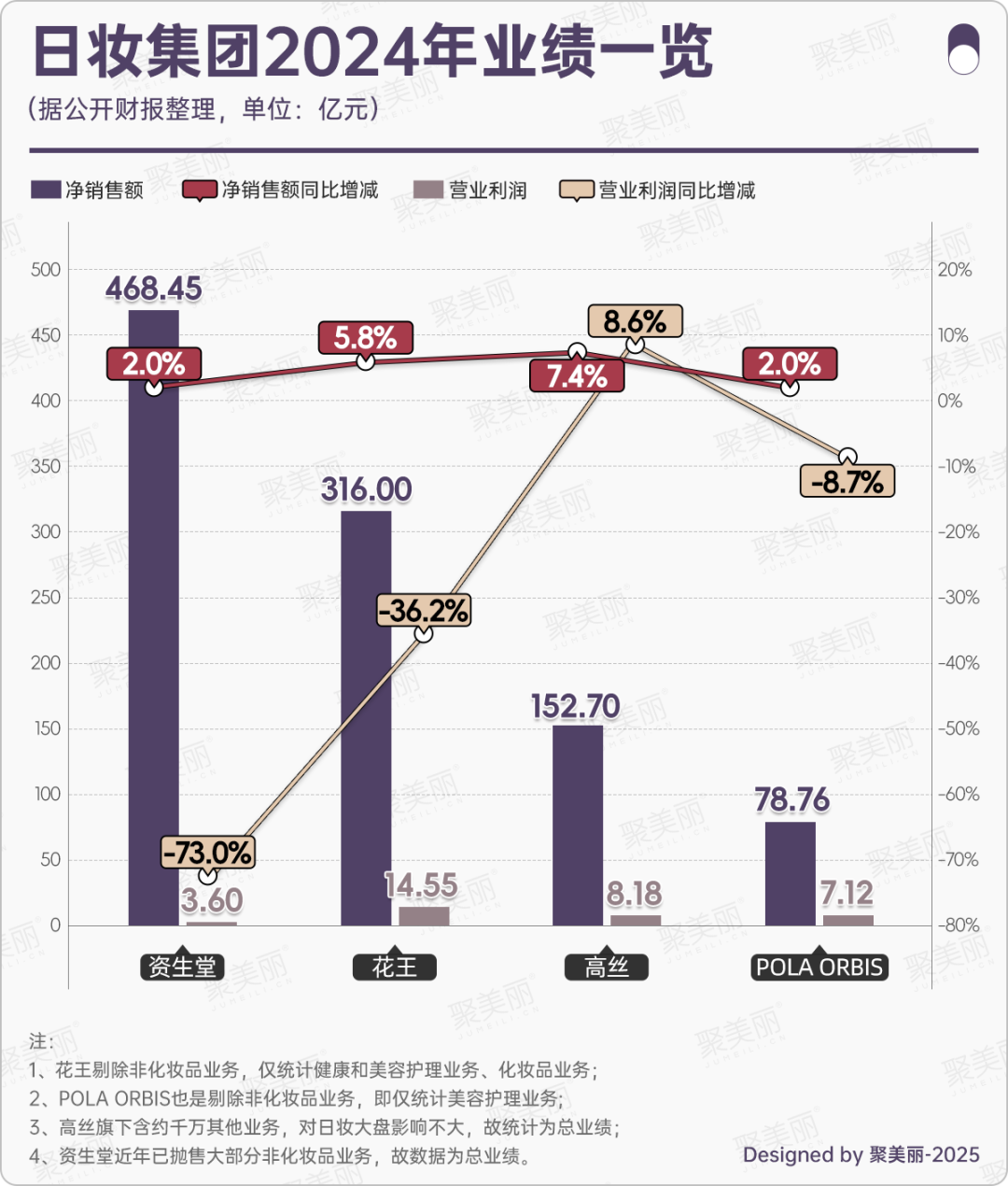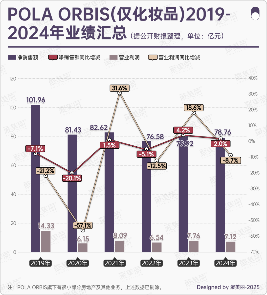 作为四大巨头中,唯一年净销售额不到百亿人民币的POLA ORBIS(仅化妆品)也同样面临盈利能力减弱的困境,其2024年营业利润跌了8.7%。