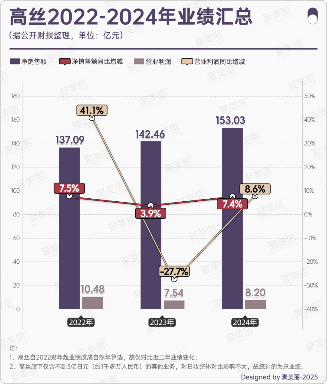 对比近三年(2022-2024年)业绩来看,高丝净销售额连增三年。细看财报,背后也呈现出一定的危机:如近三年营业利润整体走势呈下滑。