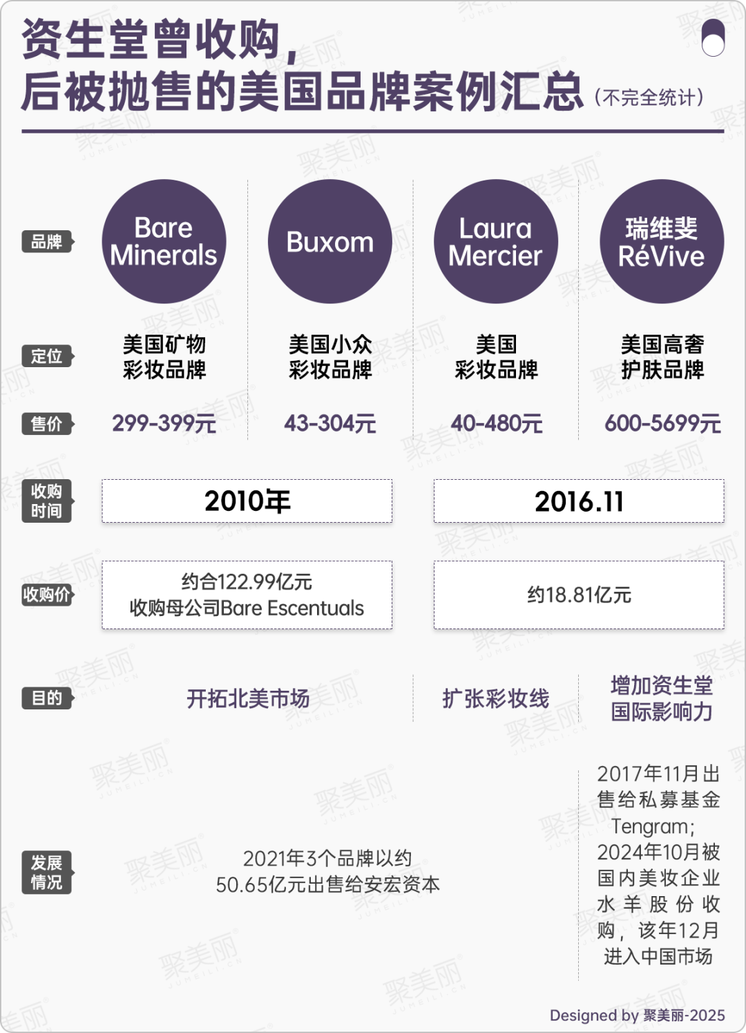 Minerals、Buxom和Laura Mercier以及高奢护肤品牌瑞维斐RéVive,目的即是为开拓北美市场及加强国际影响力,但最终上述品牌被低价折卖,原因显而易见的便是亏损导致。