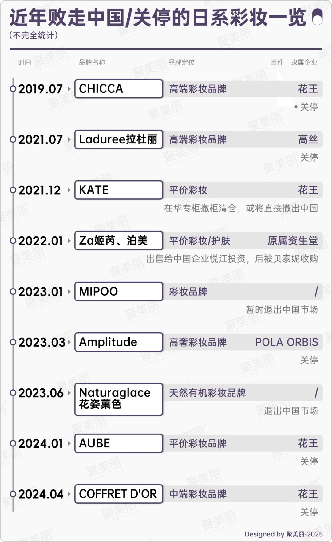 另一方面,近年来曾一度备受市场欢迎的日系彩妆逐渐在市场“失宠”,如KATE在华撤柜,以及Laduree拉杜丽、CHICCA、COFFRET D'OR(曾是全日第一彩妆)等关停。